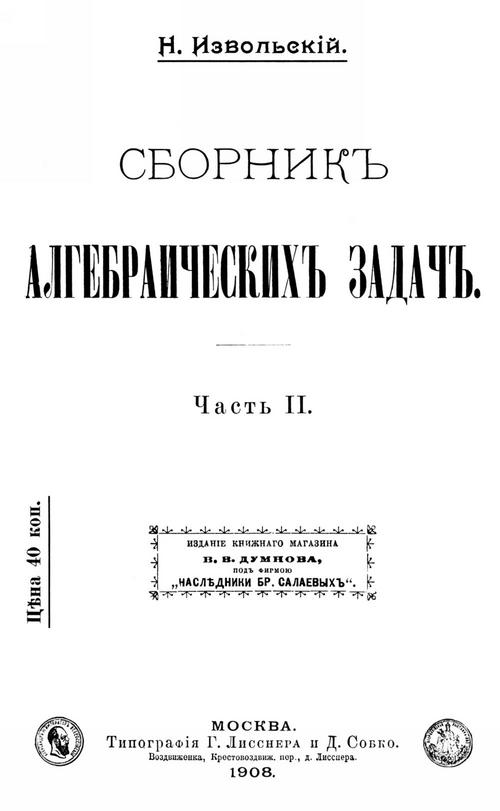 Извольский Н. А. Сборник алгебраических задач. Ч. 2. — 1908