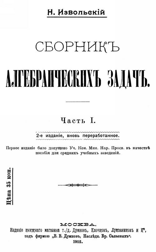 Извольский Н. А. Сборник алгебраических задач. Ч. 1. — 1912