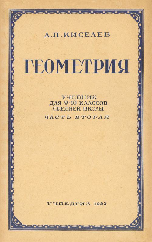 Киселев А. П. Геометрия. Ч. 1: Планиметрия. — 1962 Киселев А. П. Геометрия. — Ч. 1 : Планиметрия : учебник для 6—9 кл. семилет. и сред. школы / под ред. и с доп. проф. Н. А. Глаголева. — 21-е изд. — М. : Учпедгиз, 1962. — 184 с.Киселев А. П. Геометрия. Ч. 2: Стереометрия. — 1953 Киселев А. П. Геометрия. — Ч. 2 : Стереометрия : учебник для 9—10 кл. сред. школы / под ред. и с доп. проф. Н. А. Глаголева. — 14-е изд. — М. : Учпедгиз, 1953. — 104 с.