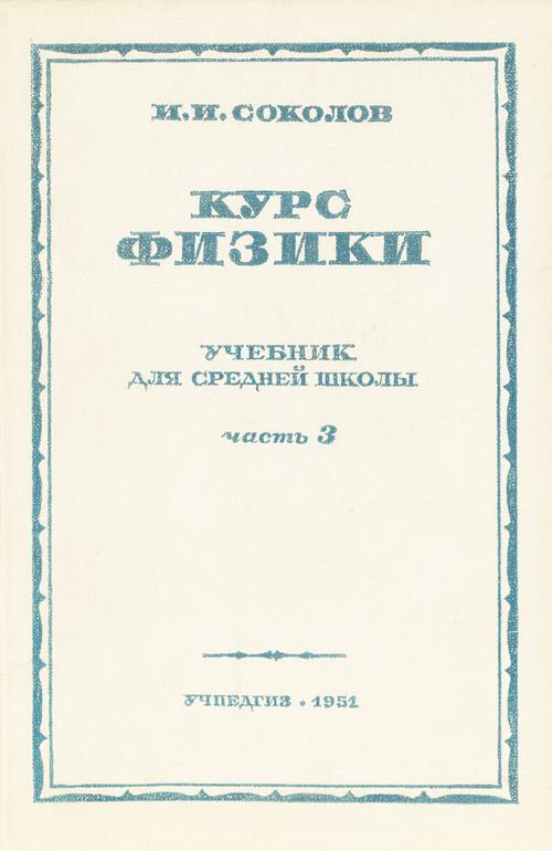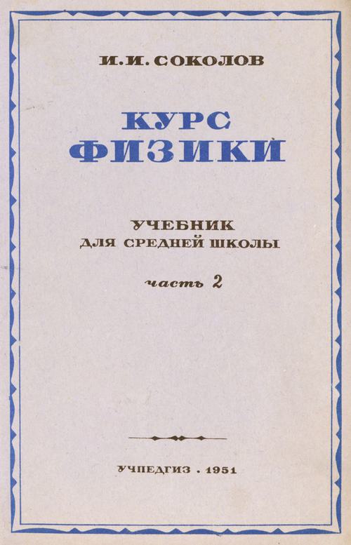 Григорьев Г. М. Курс физики: для школы и самообразования. Ч. 1. — 1923 Григорьев Г. М. Курс физики : для школы и самообразования. — Ч. 1. — 5-е изд., испр. и доп. П. А. Знаменским. — Петербург : Время, 1923. — 428 с.Григорьев Г. М. Курс физики: для школы и самообразования. Ч. 2. — 1923 Григорьев Г. М. Курс физики : для школы и самообразования. — Ч. 2. — 3-е изд., испр. и доп. П. А. Знаменским. — Петербург : Время, 1923. — 373 с., [1] л. вкл.Соколов И. И. Курс физики: учебник для 10 класса средней школы. Ч. 3. — 1951  Соколов И. И. Курс физики. — Ч. 3. : Электричество, Оптика : учебник для 10-го класса средней школы / Проф. И. И. Соколов — изд. 12-е, испр. — М. : Учпедгиз, 1951. — 400 с.Соколов И. И. Курс физики: учебник для 8 класса средней школы. Ч. 1. — 1947  Соколов И. И. Курс физики. — Ч. 1. : Механика : учебник для 8-го класса средней школы / Проф. И. И. Соколов — 8-е изд. — М. : Учпедгиз, 1947. — 240 с.Соколов И. И. Курс физики: учебник для 9 класса средней школы. Ч. 2. — 1951  Соколов И. И. Курс физики. — Ч. 2. : Колебания и волны ; Теплота : учебник для 9-го класса средней школы / Проф. И. И. Соколов — 12-е изд. — М. : Учпедгиз, 1951. — 200 с.