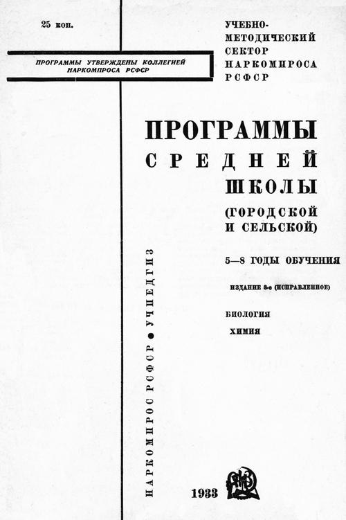 Программы средней школы. (Городской и сельской). Биология. Химия : 5—8 годы обучения / Учебно-методический сектор Наркомпроса РСФСР. — Изд. 3-е, испр. — [М.] : Наркомпрос РСФСР : Учпедгиз, 1933. — 39 с.