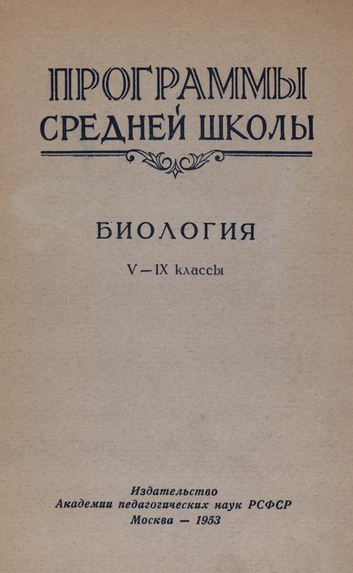Программы средней школы. Биология, ботаника, зоология, анатомия и физиология человека, основы дарвинизма : [5—9 классы] / Акад. пед. наук РСФСР, Институт методов обучения. — М. : Изд-во Акад. пед. наук РСФСР, 1953. — 56 с.