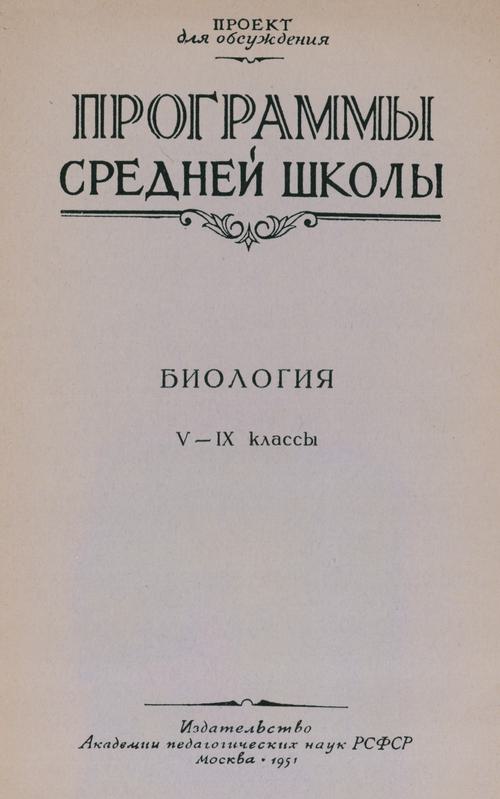 Программа средней школы. Биология : V—IX классы : проект / Акад. пед. наук РСФСР, Институт методов обучения. — М. : Изд-во Акад. пед. наук РСФСР, 1951. — 46 с.
