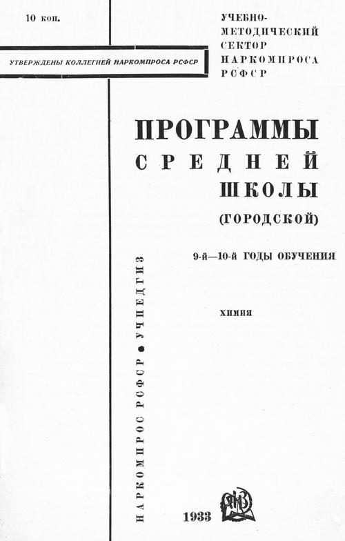 Программы средней школы. (Городской). Химия : 9-й—10-й годы обучения / Учебно-методический сектор Наркомпроса РСФСР ; сост. В. Н. Верховский, Л. М. Сморгонский. — [М.] : Наркомпрос РСФСР : Учпедгиз, 1933. — 7 с.