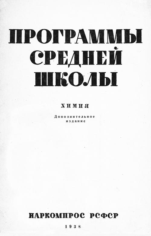 Программы средней школы. Химия / Управление средней школы НКП РСФСР. — доп. изд. — [М.] : Наркомпрос РСФСР, 1938. — 23 с.