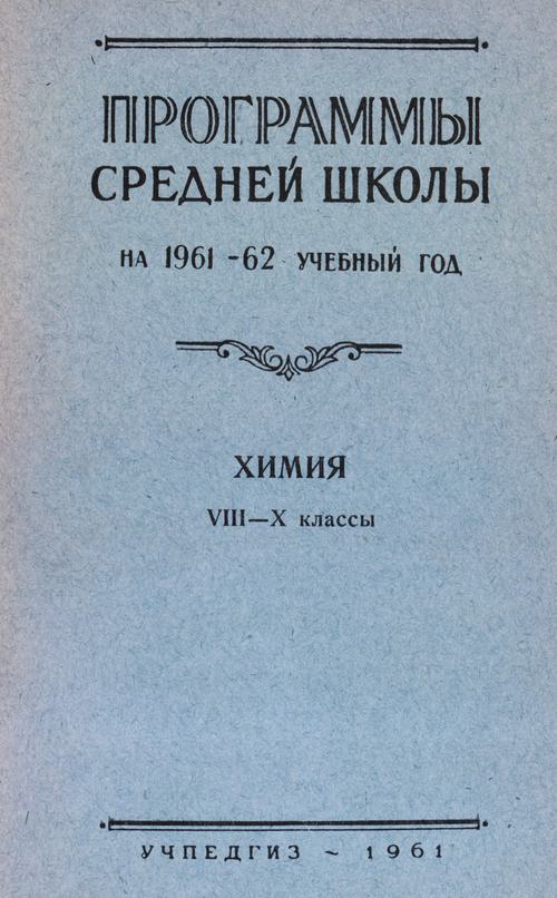 Программы средней школы на 1961/62 учебный год. Химия : VIII—X классы / Министерство просвещения РСФСР — М. : Учпедгиз, 1961. — 24 с.