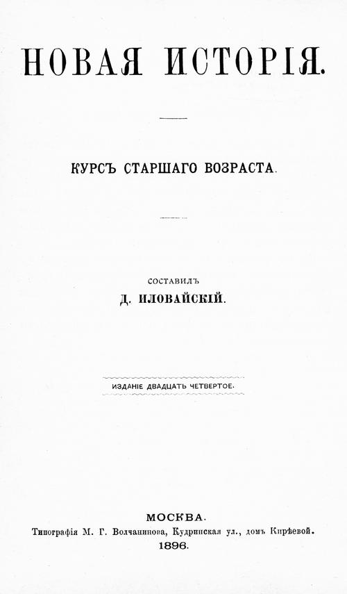 Новая история : курс старшего возраста. — 24-е изд. — М. : тип. М. Г. Волчанинова, 1896. — 240 с., 1 л. карт.